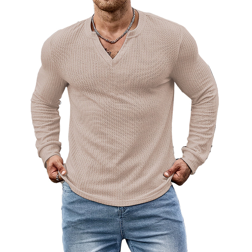 Crafted for comfort and style, this long-sleeve textured knit shirt features a modern V-neck design that enhances its sleek look. Tailored from a soft, breathable fabric, it offers flexibility and durability for any casual outing or relaxed fit. Its versatile, solid color pairs effortlessly with jeans or chinos, making it a wardrobe essential.