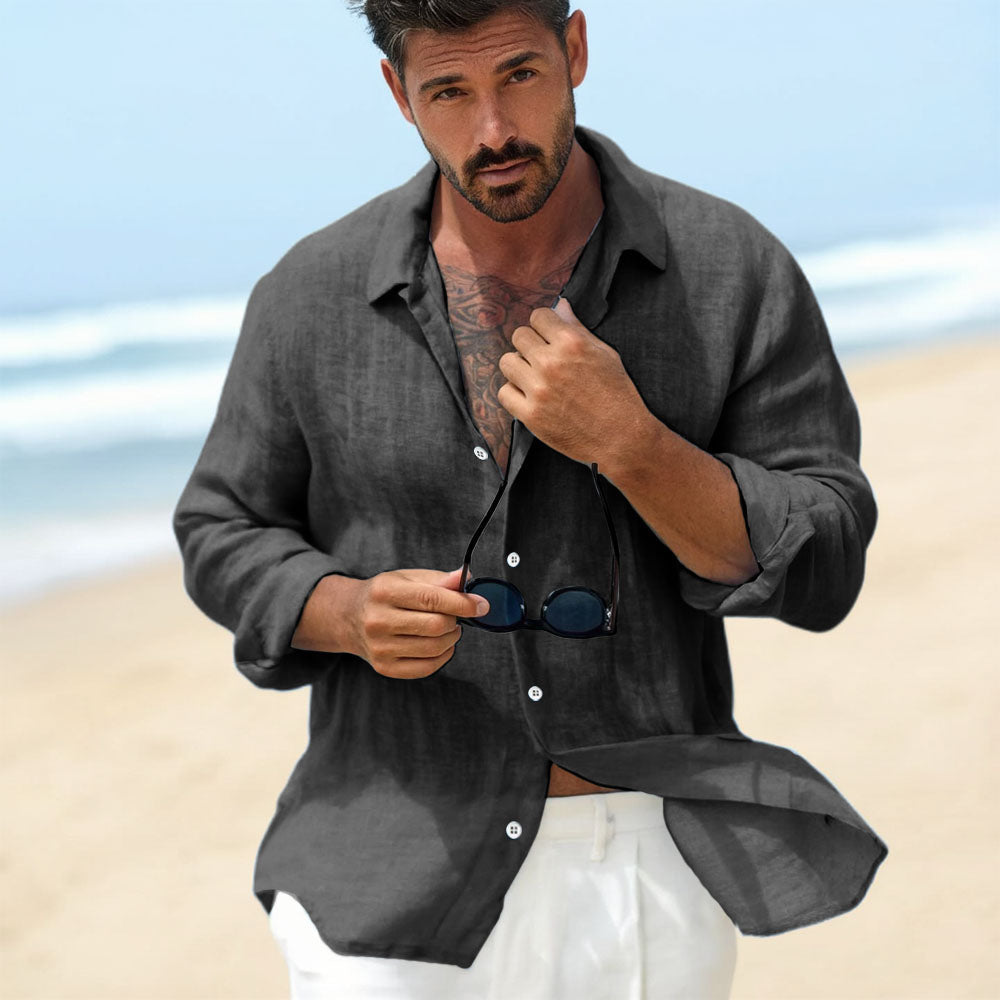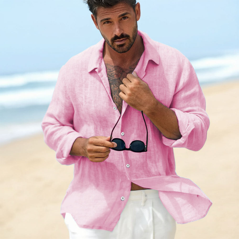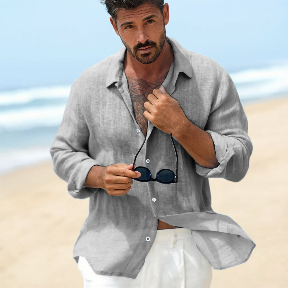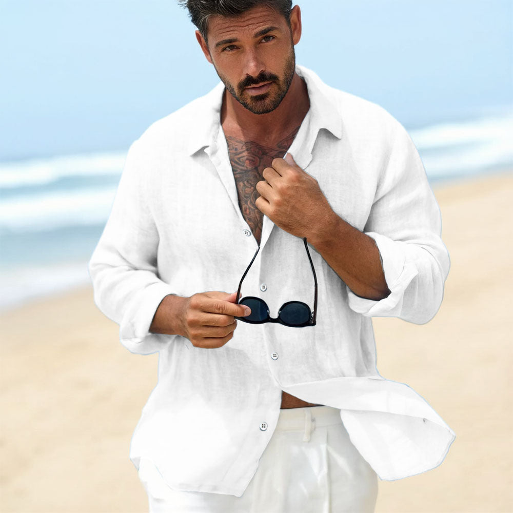 Crafted from a lightweight cotton-linen blend, this handsome shirt offers refined comfort for warm climates. Its open front and loose fit create a relaxed, seaside-inspired look, complemented by rolled sleeves that enhance its casual sophistication. Perfect for leisurely beach walks, informal brunches, or vacation retreats.