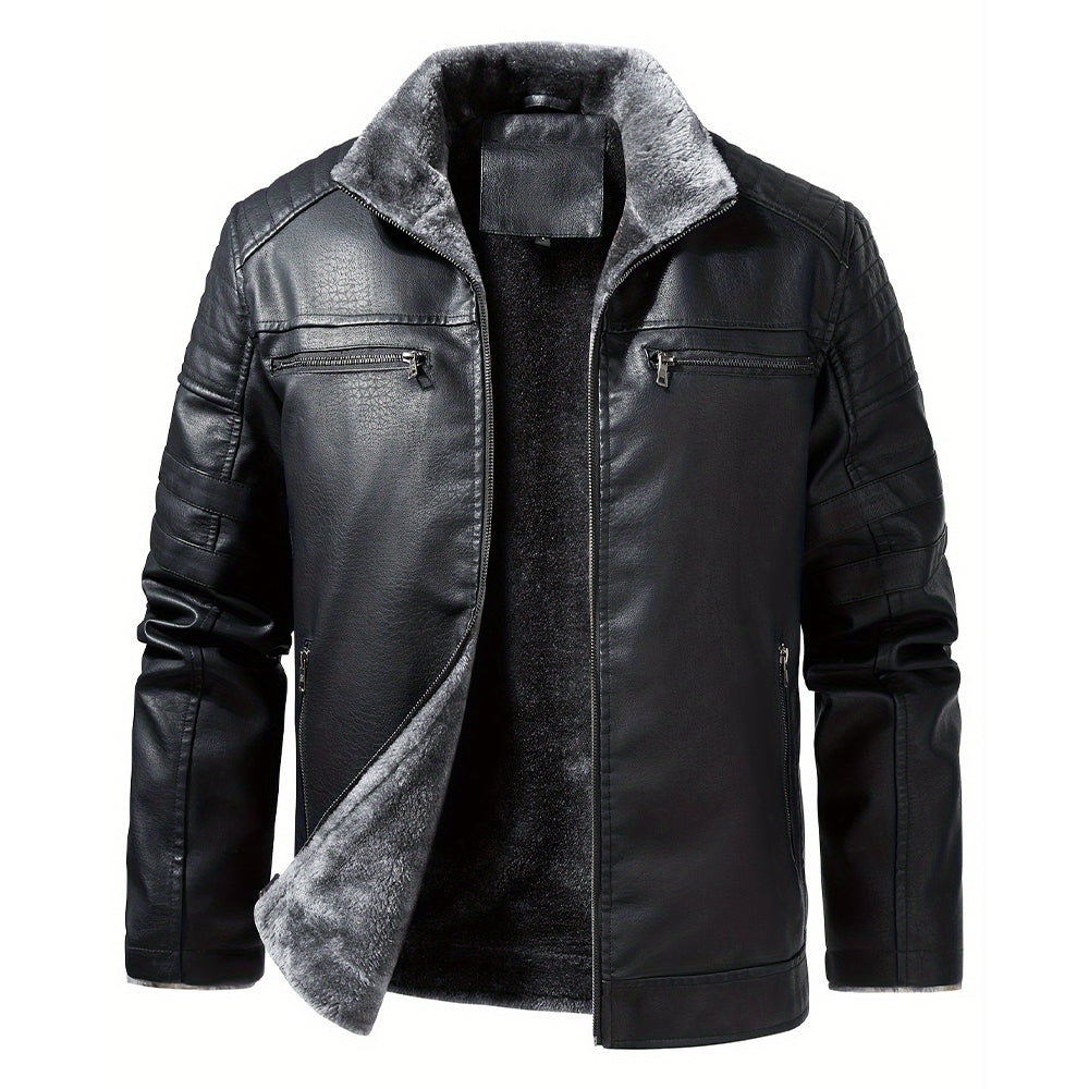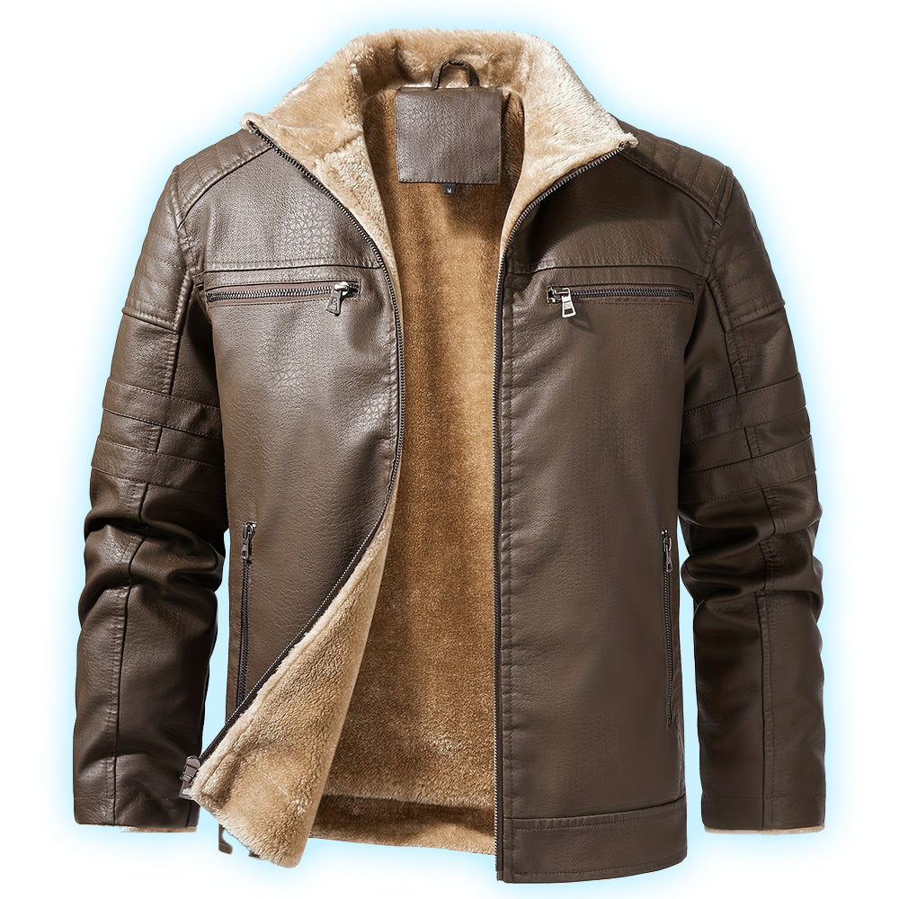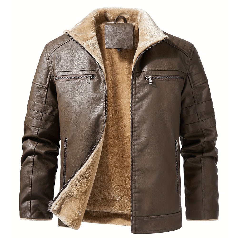Crafted with precision, this jacket boasts a sleek leather-like exterior paired with an ultra-soft fleece lining for unmatched warmth and sophistication. Thoughtfully placed zippered pockets and bold stitched accents enhance its rugged charm, making it a standout piece for effortless style in any season.